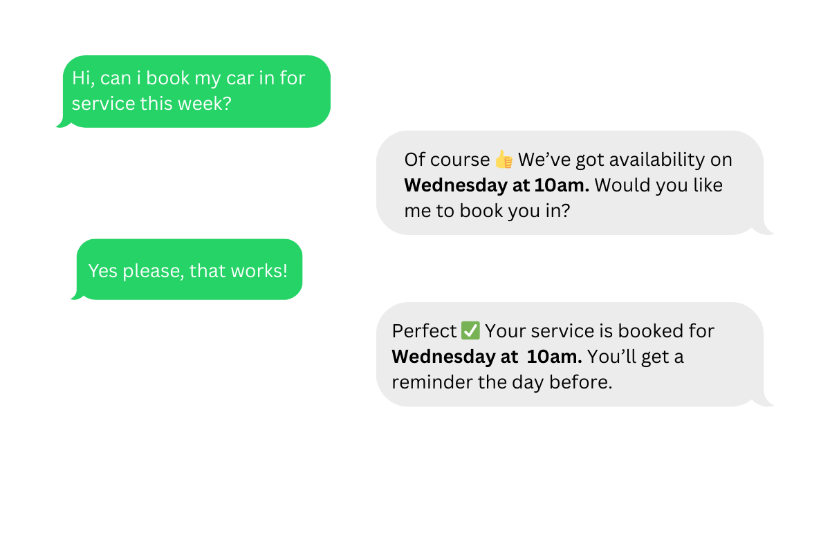 ✅ Service and MOT reminders✅ Quote & missed call follow-ups✅ Reveiw booster for Google and more✅ 24/7 WhatsApp Chatbot✅ Booking flows and live notifications✅ End-of-day summaries✅ Customer database sync✅ Unlimited customers✅ Email & WhatsApp support