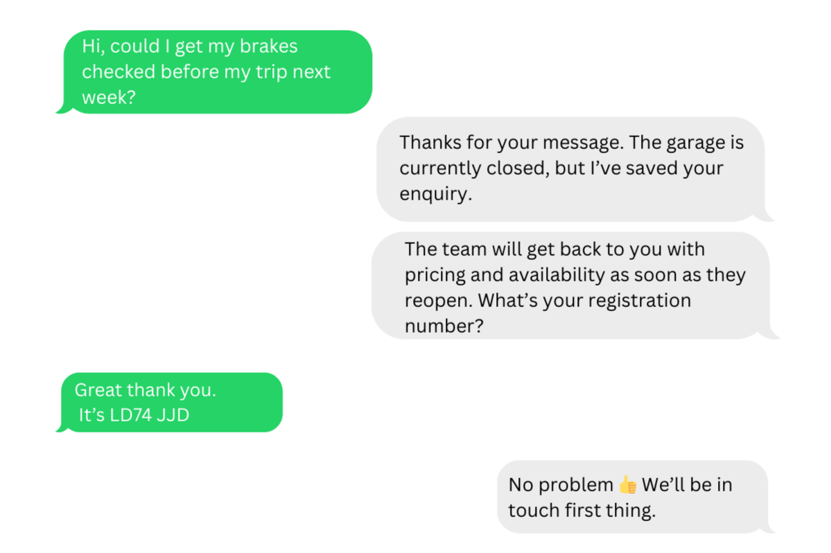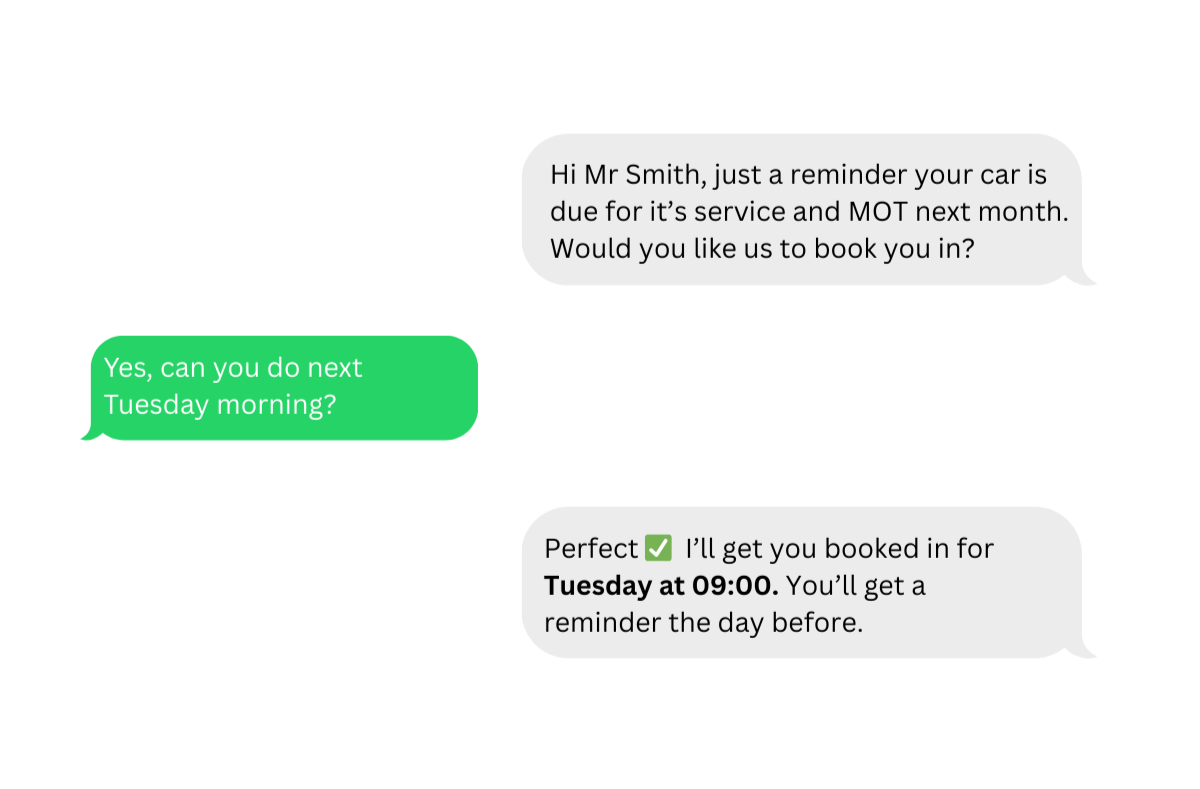 ✅ Service and MOT reminders✅ Quote & missed call follow-ups✅ Reveiw booster for Google and more✅ 24/7 WhatsApp Chatbot✅ Booking flows and live notifications✅ End-of-day summaries✅ Customer database sync✅ Unlimited customers✅ Email & WhatsApp support